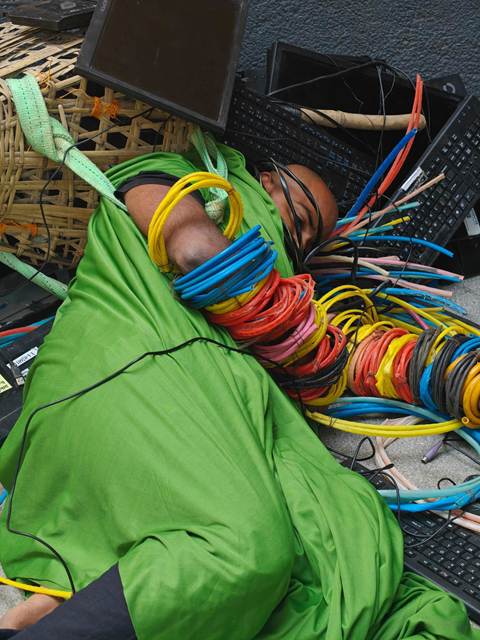 The work began at the entrance of Triveni Kala Sangam. Durugadda appeared carrying a heavy load of laptops, keyboards, mice, monitors and tangled wires. Cables draped from his neck and arms, while a basket filled with digital devices weighed him down further. As he moved forward, a single word echoed again and again through the space: “Digital”