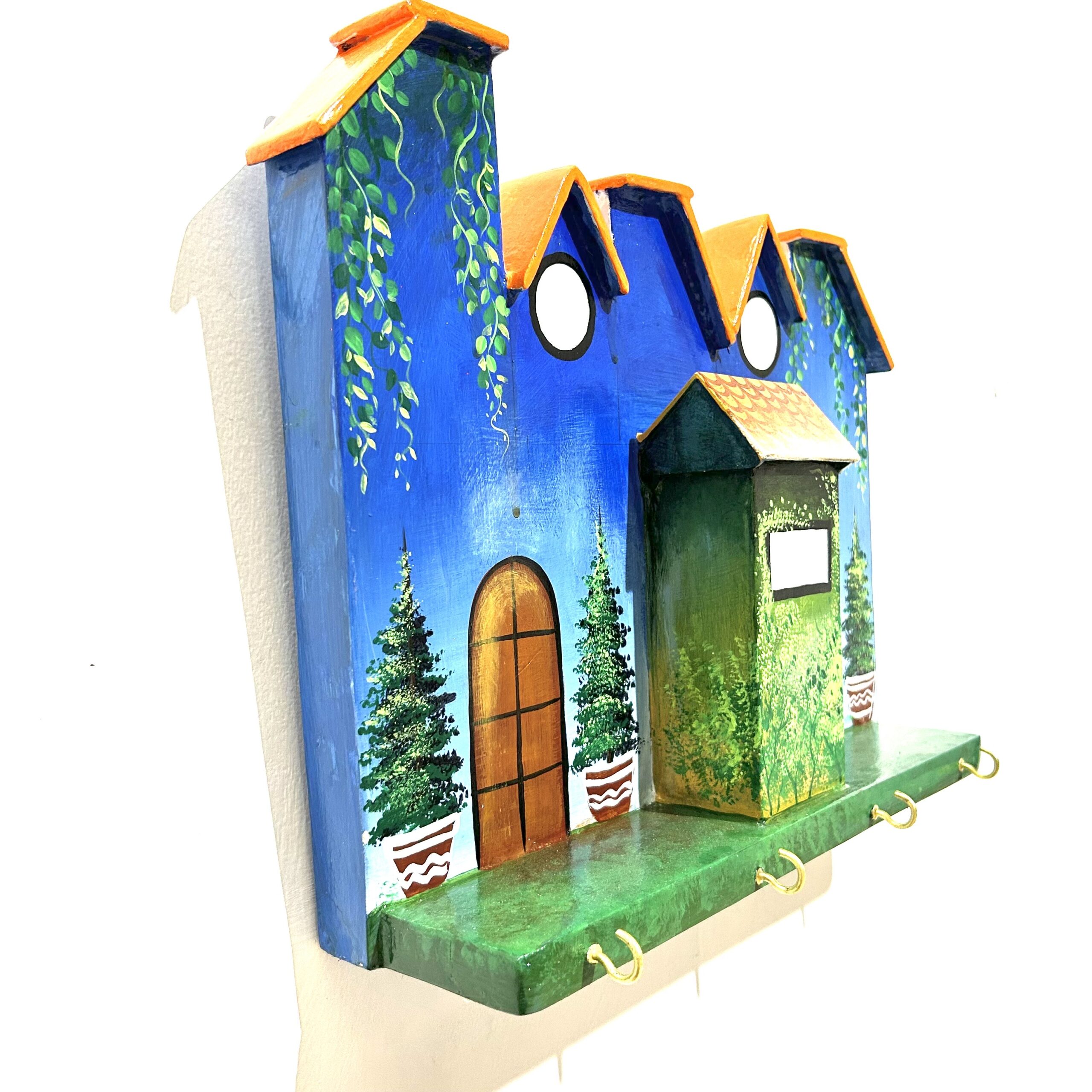 Transform your entryway with this charming Decorative Wooden Key Holder. Featuring a whimsical blue house design with orange trim, climbing vine details, and potted evergreen trees, this hand-painted wall-mounted key rack blends practicality with artistic appeal. Two wooden arched doors and decorative circular windows add a cottage-inspired architectural touch, while the green base with multiple brass hooks keeps your keys neatly organized.