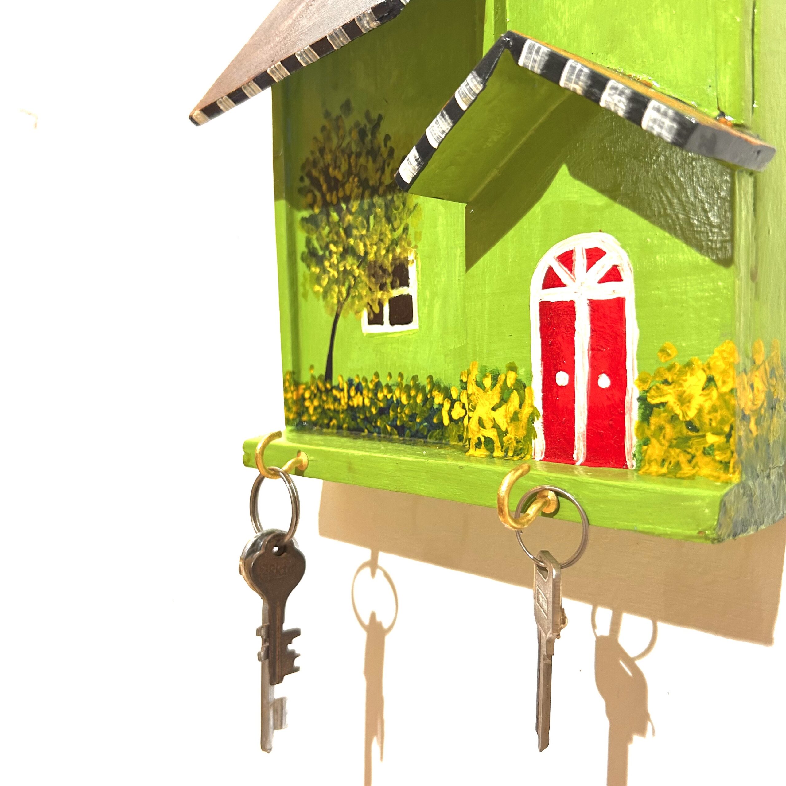Introduce delightful artistry into your space with this Hand-Painted Miniature Wooden House Key Holder. Meticulously crafted by artisans, this piece presents a small house motif, each detail painted by hand with vibrant, lasting colors. What makes it even more appealing is its dual purpose: not just a decorative wall piece, but also a practical key holder.